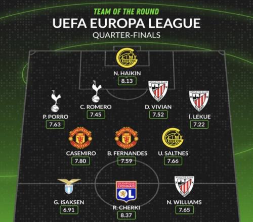 体育资讯4月18日报道宣称 欧联杯1/4决赛次回合比赛全部战罢,数据网站Whoscored盘点了本轮比赛评分最高阵容,其中切尔基领衔锋线、B费、卡塞米罗在列,具体如下: