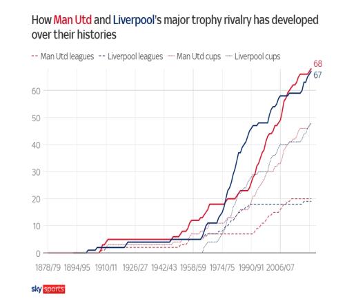 1992 年英超联赛开始时,利物浦比曼联多18座奖杯,但由于弗格森带领曼联取得了前所未有的成功,2010/11 赛季的英超和社区盾双料冠军让红魔自20世纪70年代初以来首次领先。随后曼联几乎一直处于领先。若曼联还想保持优势,他们必须在本赛季欧联杯上有所作为。