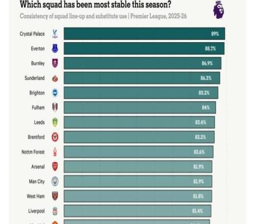 12月18日,The Athletic发布文章,对本赛季英超各队的出场阵容稳定度进行了分析,其中,水晶宫是稳定度最高的球队,切尔西最低。The Athletic创建了一个“阵容稳定性评分”,用来衡量每
